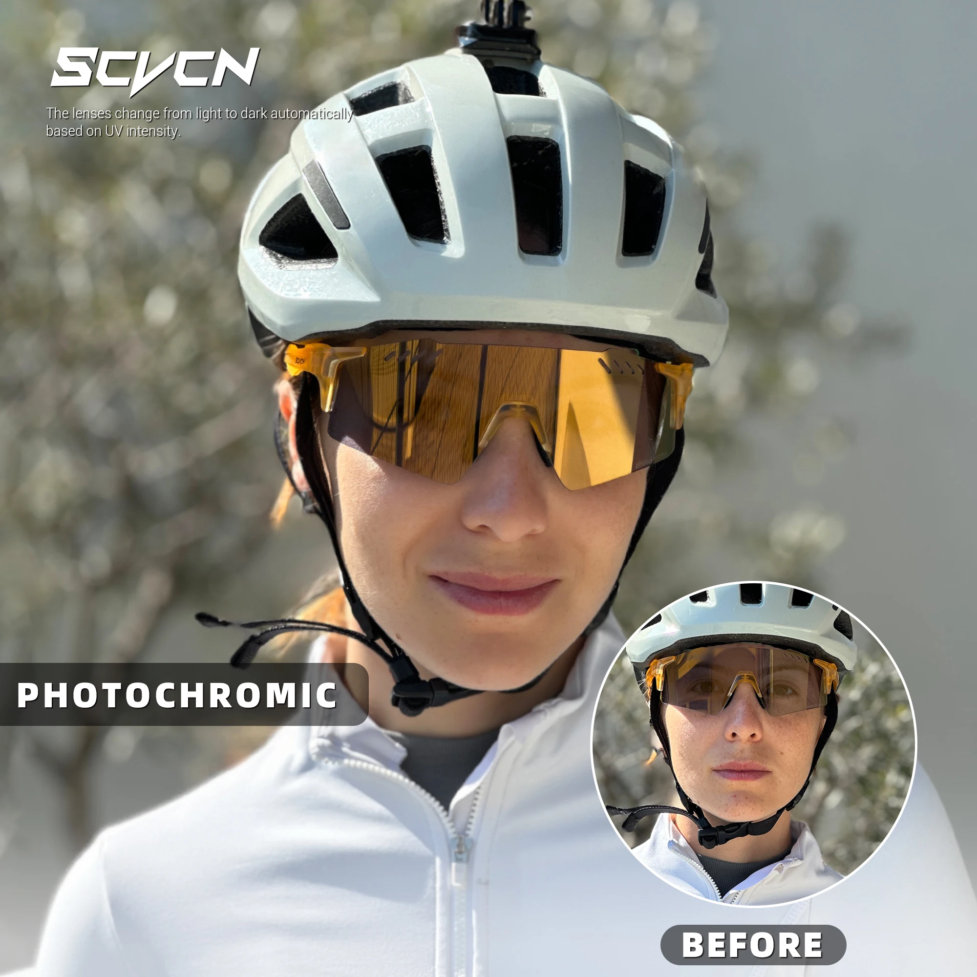 The SCVCN Photochromic Cycling Glasses provide versatile eye protection for cycling and outdoor sports. Photochromic lenses automatically adjust tint based on lighting conditions for optimal visibility. UV400 protection blocks harmful UVA and UVB rays to keep your eyes safe. Lightweight and durable frames ensure comfort during extended use. Wrap-around design provides wind and debris protection for cycling, MTB, or road rides. Ideal for a variety of outdoor activities, including golf, camping, and driving. Adjustable nose pads offer a secure, customized fit. Polarized options reduce glare on reflective surfaces for clearer vision. Stylish design combines functionality with modern aesthetics. These glasses are perfect for active individuals seeking reliable, high-performance eyewear for multiple sports.